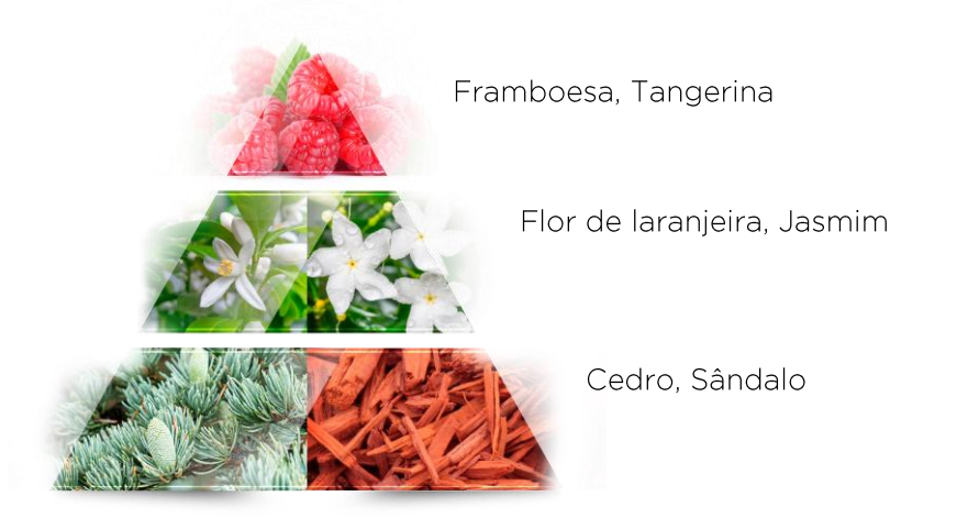 A framboesa e a tangerina trazem frescor e energia, enquanto jasmim e flor de laranjeira adicionam um toque sensual. As notas amadeiradas deixam o perfume marcante.