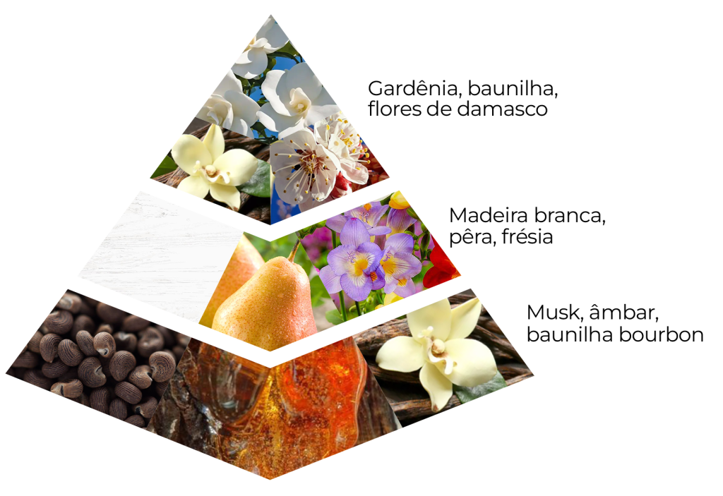 A jornada se inicia com uma mistura radiante de gardênia, damasco e flores silvestres. Um convite doce e floral à elegância. O coração se desdobra em uma fusão suave de madeiras claras, pera e frésia, adicionando frescor etéreo e uma sensualidade graciosa. Ao assentar na pele, a base permanece com uma mistura envolvente de musk, âmbar e baunilha bourbon, deixando um rastro luxuoso de calor e sedução.